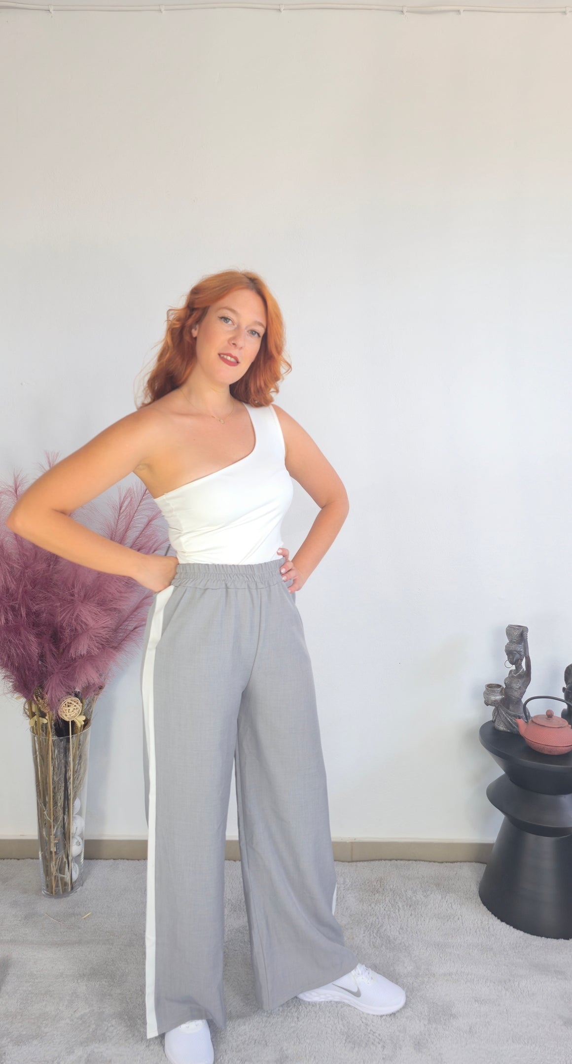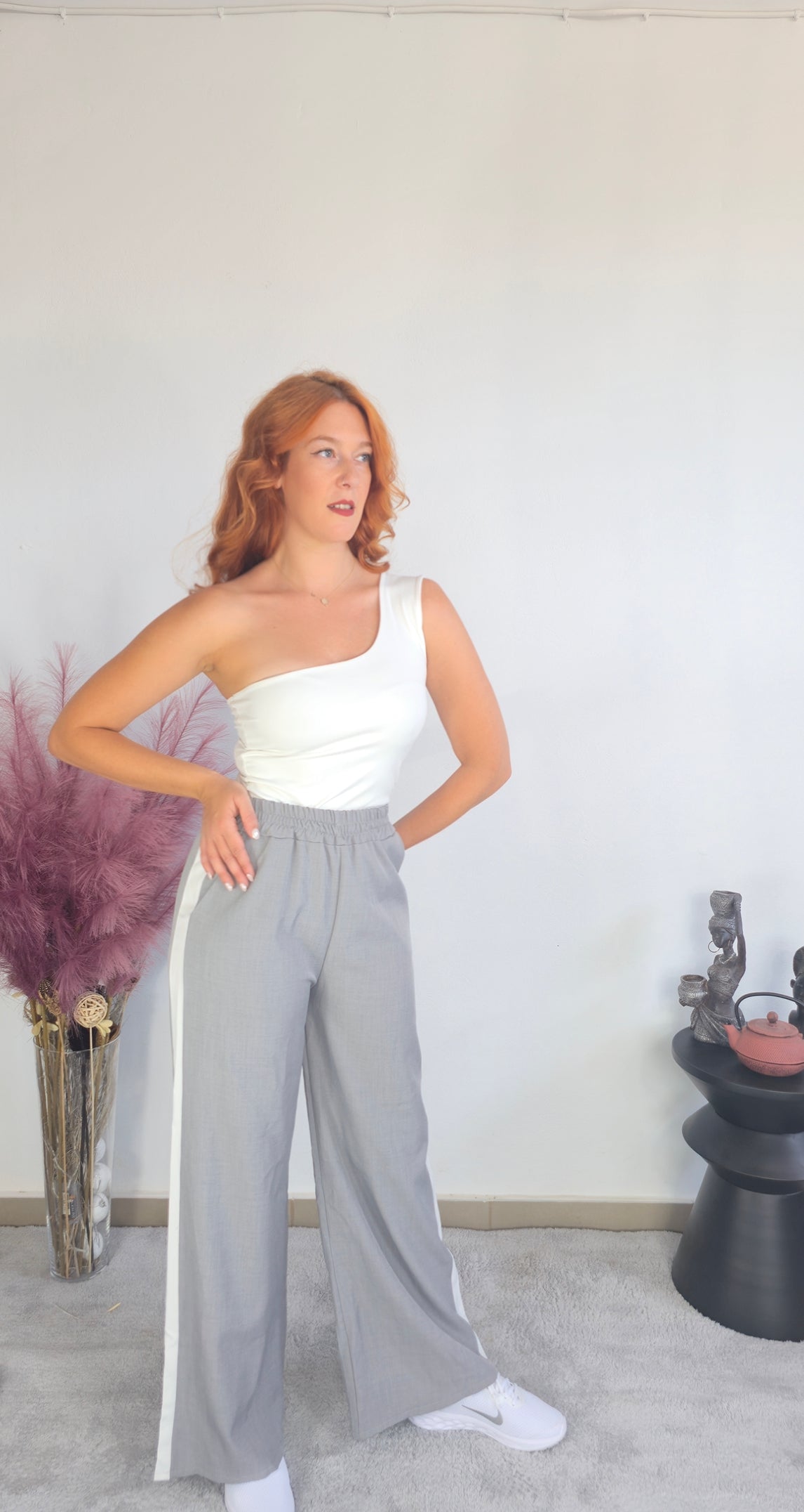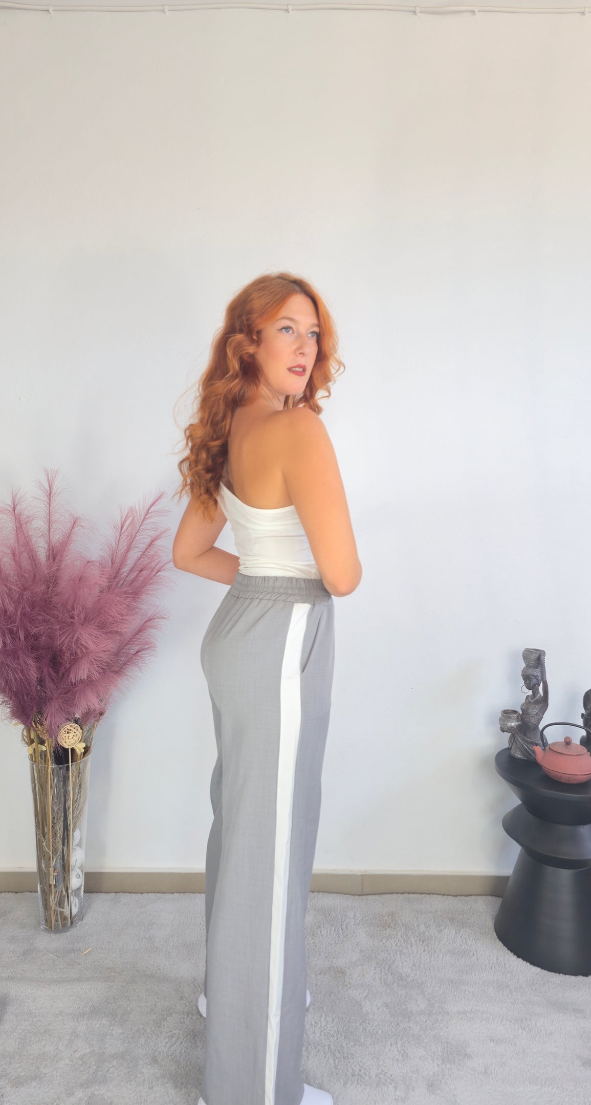 Παντελόνι με λάστιχο στην μέση υφασμάτινο με ρίγα στο πλάϊ.